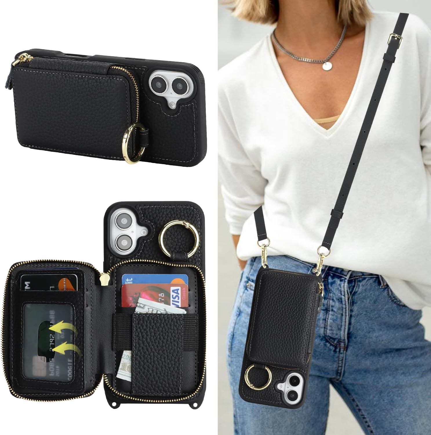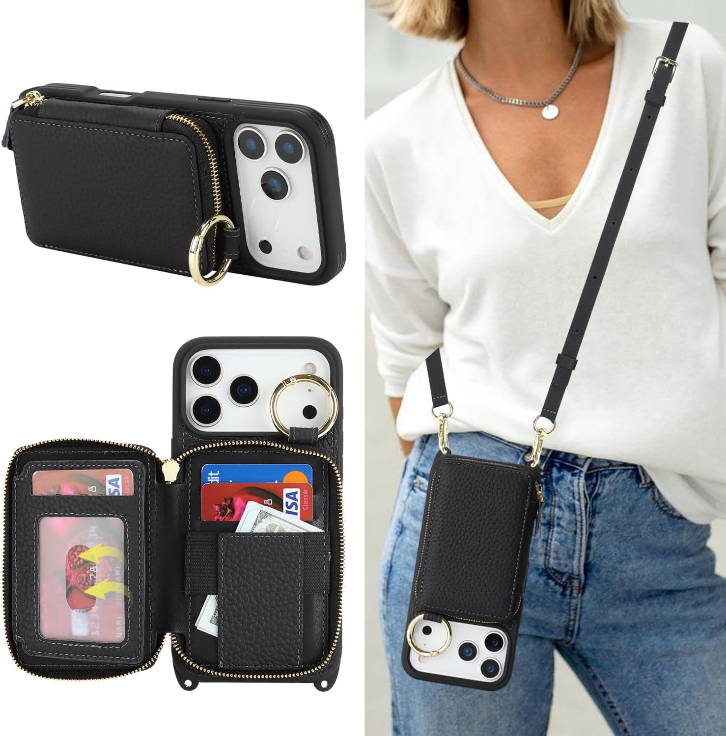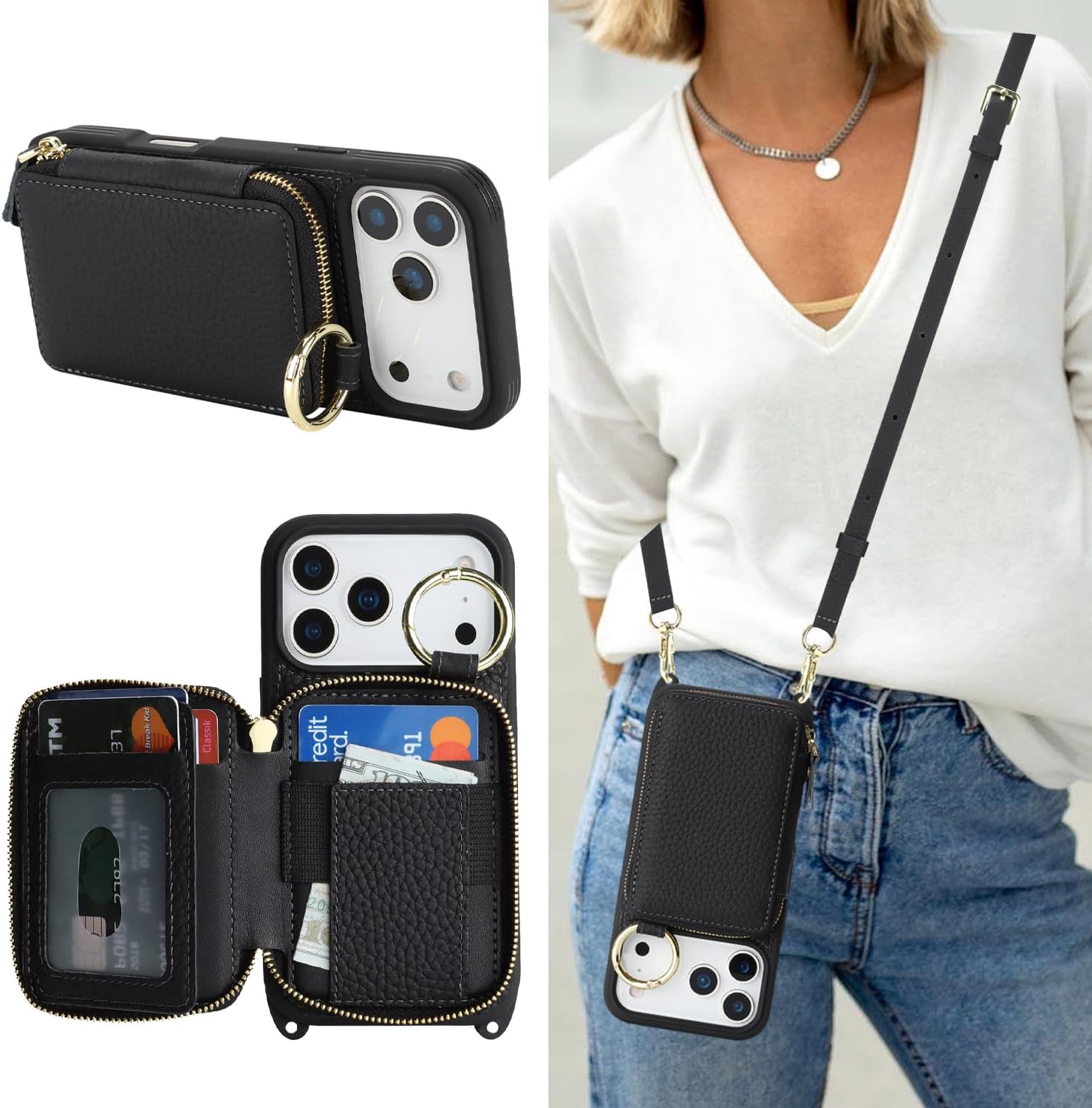 Cavor Genuine Leather for iPhone 14/13 Wallet Case with Card Holder for Women Men,for iPhone 14/13 Case with Strap, Crossbody Lanyard and Wristlet Zipper Phone Case-Black